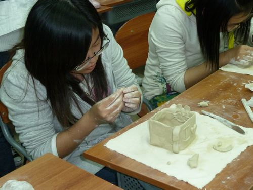 下面就是同学自主制作陶艺了。同学们各个拿着自己面前的陶泥跃跃欲试、摩拳擦掌,一脸兴奋地样子。在制作之前,老师向同学们教授制作一个杯子的具体步骤以及注意事项,并进行简单的示范。接下来同学们就动手制作了,虽然只是做一个简单的杯子,但说起来容易做起来难,在做杯底时,一些同学就遇到麻烦了,他们不得不揉掉重新做,不过好在还有老师在旁边亲自为他们辅导。最后,在同学们的构思和精心制作下,一件件形态各异的成品诞生了!在制作杯子的愿望破产后,一些同学转变思路,制作了笔筒、装饰品、储物罐。各个都非常有创意,非常精美。老师也直夸同学做的好,同学们看着自己的作品露出了喜悦的笑容。