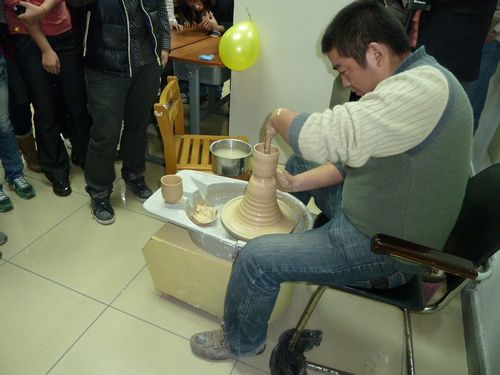 接下来陶艺老师老师向同学们细致的介绍了制作陶艺的工具和不同泥巴的不同用处。在介绍陶艺成型的形式时,由另一位陶艺老师现场表演了陶艺拉坯的过程,同学们纷纷上前围观,只见一块丑陋的泥巴随着转盘的转动在离心力的作用下渐渐伸长、成形,顷刻间在老师的手里就变出一只杯子,一个碗。老师娴熟的技巧、精美的作品让在场的同学们叹为观止。在这过程中,老师还向同学介绍了拉坯的具体要求、泥巴的质量,让同学们更加深入的了解制陶过程。