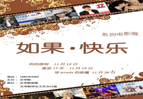 11月12日、18日、26日分别在1002幢楼的2203室播放了三部电影:《妈妈咪呀》、《重返17岁》和《时尚女魔头》。本次电影展播系列活动由文学院学生会心理部主办,主题是:“如果.快乐”。