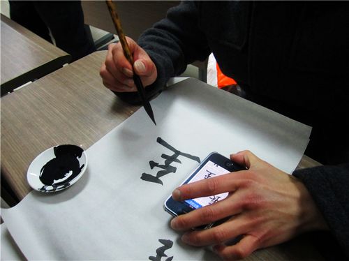 接着,参与本次的活动的书画爱好者们用云天书画社提供的笔墨纸砚,根据之前的辅导进行了练习。云天书画社的社员们针对他们的握笔姿势,点横撇捺,写字的速度等进行了现场的指导,指出了他们存在的不足,并且亲自给他们做示范。同学们学会了很多毛笔的书写技巧,更加热爱了软笔书法。