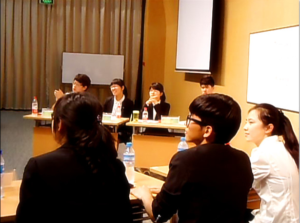 接着,比赛正式开始。首先由正方陈述自己的观点,总计七分钟,在期间,对方辩手提出了反驳意见,双方由此展开辩论,一个环节接着一个环节,双方选手唇枪舌剑,流利的英文,缜密的思维,激烈的论辩,赢得场上观众阵阵热烈的掌声。随着终结铃声的响起,比赛结束。评委们离席讨论比赛结果。在评委离席期间是辩手与惯纵们的互动时间,由观众任意向辩手提出问题。观众们广泛积极参与,与选手们又展开了一场激烈的辩论。