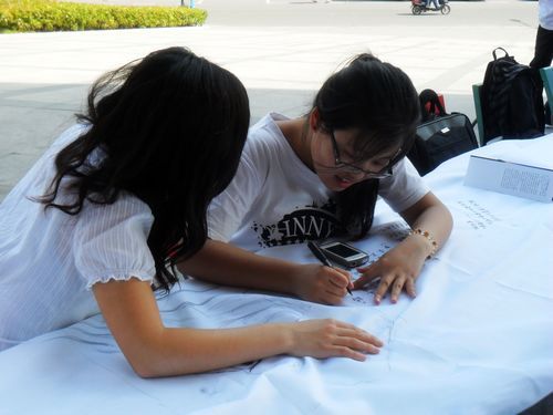 再将镜头转向十米长卷书画展的现场,已有几位同学挥笔泼墨起来。一条小鱼搭配着诗经中唯美的句子,一杆修竹装饰着唐诗里精华的养分。有人豪气冲天地写下李白的侠客行,也有人冷静睿智地录出荀子的天行有常。