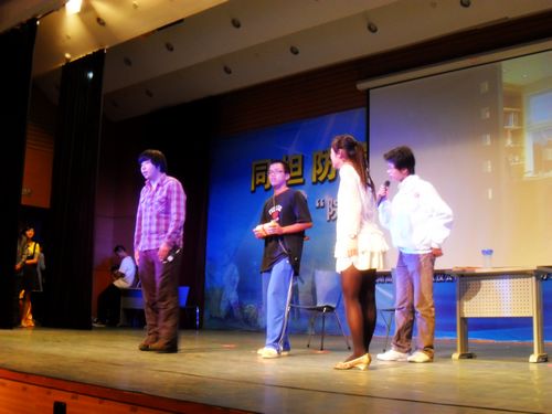 比赛还没有开始时,报告厅内已经坐满了观众,文学院的拉拉队也已经做好了呐喊助威的充分准备。七点整,比赛在一段精彩绚丽的开场舞中拉开帷幕,之后主持人介绍了到场的嘉宾和评委,担任本次大赛决赛的评委有国家一级演员、中国梅花奖获得者、著名滑稽表演艺术家张克勤老师,苏州工业园区团委书记汤剑峰先生等。评委们将从表演内容、演技、台风等方面给每支代表队严格打分。