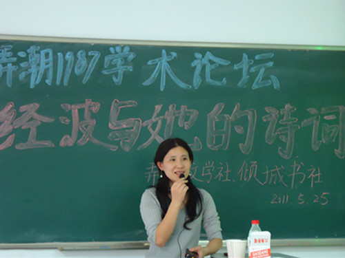 2011年5月25日下午四点在文综楼1003#3102教室,举办了一场弄潮1987学术论坛。经波老师作为特别来宾为在场观众讲述了一些古典诗词相关的内容。本次学术论坛由苏大文学院学工办和文学院社团联合会主办,由弄潮文学社和倾城书社承办。
