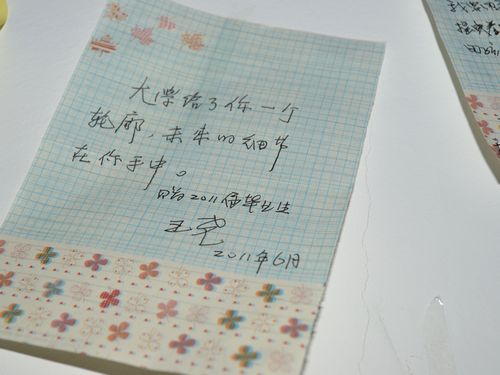 送爱心,送关心,也送祝福。毕业生们每人写一张没有收信人的祝福便笺,然后贴在白色的墙壁上,在毕业典礼上,把许愿墙置于入口,让进入的毕业生随机拿一张便笺,收获同学对自己的祝福。是的,为离别道一声珍重,为相聚留下期许。