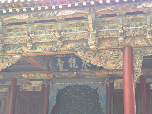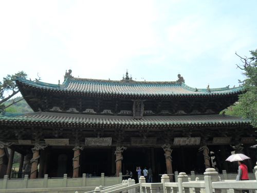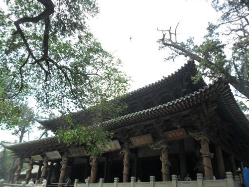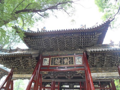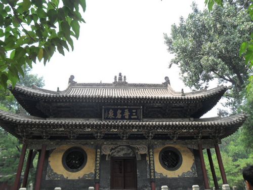 在这条中轴线上,我们见识到了晋祠的“三绝”,难老泉、侍女像和周柏唐槐。晋水有三个源泉,一是善利泉,一是鱼沼泉,一是难老泉。难老泉是三泉中的主泉,晋水的源头就从这里流出,长年不息,水温保持在17℃,每秒流量是1.8立方米。关于难老泉,还有着一个“柳氏坐瓮,饮马抽鞭”的民间故事。侍女像是指圣母殿内的宋代彩塑。圣母殿是北宋年间为叔虞之母邑姜修建的一座规模宏大的殿堂。殿内供奉着四十三尊彩塑。主像是圣母邑姜,其余四十二尊是宦官、女官和侍女。其塑造手法突破了古代寺院中宗教题材的平淡,采用现实主义的创作手法,塑造了具有丰富思想感情的人物形象,是中国古代泥塑的精品,有极高的艺术价值。其中有一尊侍女很特别,有半边脸是荡起微笑,还有半边脸却是哭得肿了起来,眼角含泪,也许她的刚刚表演完一场成功的歌舞,受到了表扬,但是心里却在想年华易逝,当自己红颜老去时该如何是好。这也反映了当时宫廷中的特殊状况。周柏是北周时代种植的柏树,唐槐是唐代时种植的槐树,至今都还茂盛葱郁。周柏已有三千年的历史,这在全国都是极为罕见的,因和晋祠年代相当,所以又叫“齐年柏”。