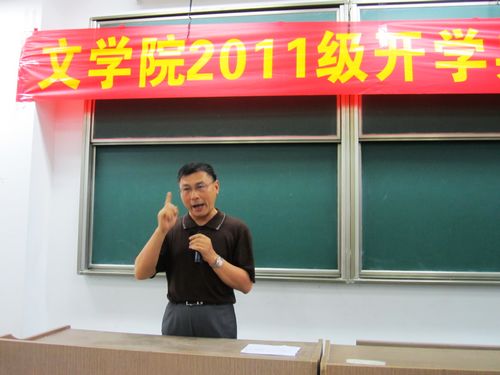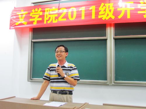 第二部分:新生见面会。文学院副院长黄镇伟为11级新生介绍了文学院的专业情况,使同学们对专业问题有了初步的了解,在军训后的职业生涯规划课程中还将有详细的指导。