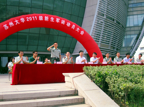 2011年8月29日上午8时50分,苏州大学独墅湖校区军训动员大会在炳麟图书馆北广场准时开始。学校和学院的各位领导、军区指挥官、全校区所有营队及各位辅导员老师参加了本次大会。我院党委副书记、副院长张健,2011级新生辅导员赵曜出席了此次大会。本次活动由政委张国华同志主持。