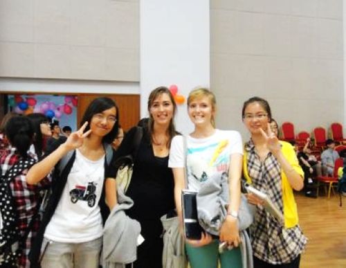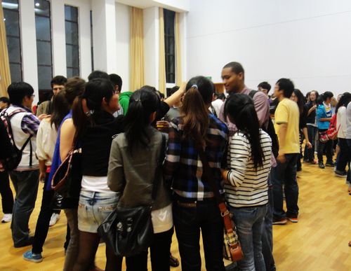 进场之前,活动举办方发给每位参加活动的学生写有编号的纸片,学生们进场后寻找与自己编号一致的异国友人,两两配对,以便更深入的交流。大家就热情地呼喊自己的编号、大胆地挥手打招呼。寻找到搭档后,大家便开始了自我介绍,一时间,活动现场欢声笑语不断,大家纷纷与自己的新朋友交流起来。