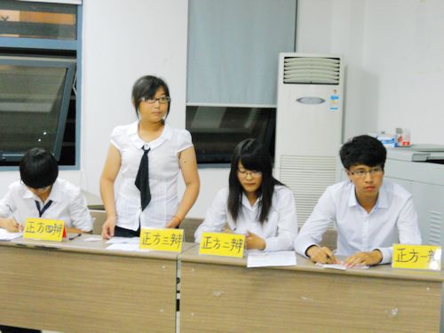 第一场的辩题为网络是否拉近了人们之间的距离,正方由我院汉语言文学师范1班的4位辩手组成,就“网络使人们的距离越来越近”这一观点展开了论述。反方以我院中国语言文学大类4班的4位辩手为代表针对正方提出“网络使人们的距离越来越远”。第一个环节是开篇立论,正反方一辩分别进行陈述自己的观点,正方一辩从四个方面阐述了正方观点,为接下来的对辩环节奠定了基础,反方一辩也不甘示弱,全面阐释了自己的观点。接下来是对辩环节,双方的二辩开展了唇枪舌剑的对阵,激烈的比赛现场高潮迭起。2分钟的对辩结束后,紧接着是盘问小结环节。这一环节结束后比赛已经进入到白热化阶段,最激动人心的自由辩论环节开始,每个辩手开始充分发挥自己的优势,咄咄逼人,步步紧逼,评委也不时地为辩手们鼓掌。最后,由双方四辩总结陈词,现场立刻安静下来,评委也即将开始退席评议。评委退席讨论期间,现场观众可以自由提问,对于观众的提问,辩手们意犹未尽,全力以赴地去应对。十分钟后,评委入席,首先点评了双方,肯定了辩手的出色表现,也指出了专业性的问题,最后正方因稳重而敏捷获得了胜利,最佳辩手由正方四辩囊括。