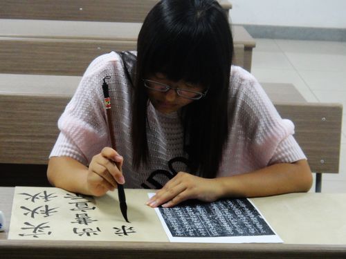 结束了对钟繇的介绍,社员们便在社长的指导下开始练习。都说书法是一门艺术,一门陶冶人的艺术,看来的确如此。社员们在书法的世界中遨游,忘记了时间,忘记了外在的世界,似乎都成了一花一世界的脱俗之人,整个教室溢满了一种别致的情怀,让人忍不住融入其中。社员们的书法基础虽然参差不齐,但他们却都同样的认真,社长也一直在耐心地指导着他们,当然,这不仅仅是单方面的指导,社员们也提出自己的看法,积极地与社长、与同学交流,相信在这样融洽的氛围中,假以时日,社员们一定会有长足的进步。