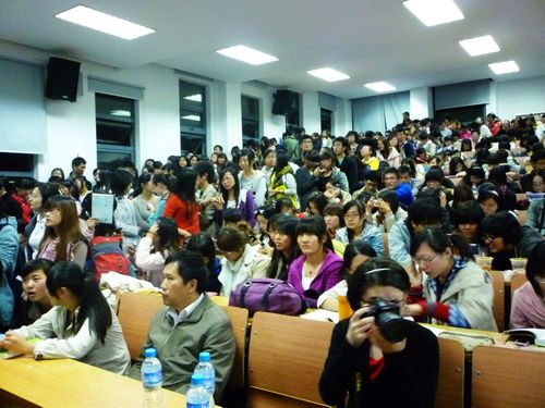 七点的指针甫指上空,席慕蓉老师到达了文综楼1001-1101教室。教室里立刻传来了极热烈的掌声,但很快便恢复了安静,因为大家知道,一个诗人,一个文学家,需要的是他人的尊重,而这样的尊重便是安静地聆听。