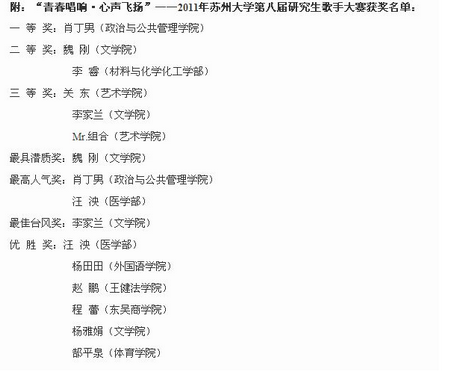 11月4日晚,由苏州大学研究生会主办的“青春唱响・心声飞扬”苏州大学第八届研究生歌手大赛决赛在独墅湖校区医学部学术报告厅隆重举行。一轮轮激烈角逐后,文学院研究生魏刚、李家兰、杨雅娟晋级十二强,并在决赛中取得佳绩。