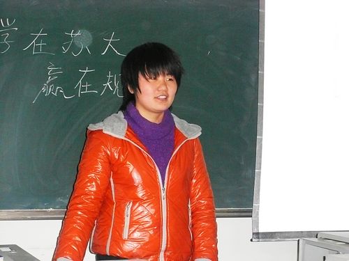 随后,大一新生代表张梦同学进行了精彩发言,在幽默的开场白之后,她在黑板上写下了“学在苏大,赢在规划”四个大字。并讲述了自己作为班长的心路历程,与大家分享了自己在学生社团里的所学。张梦同学的大方得体和幽默风趣,赢得了同学们的阵阵掌声。