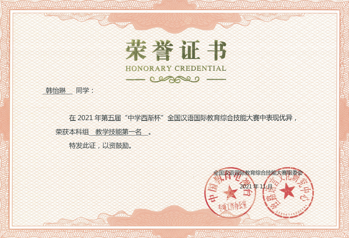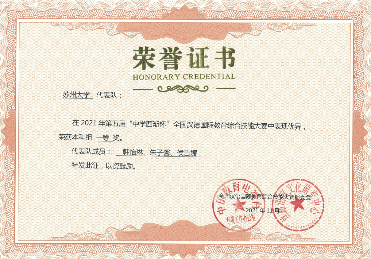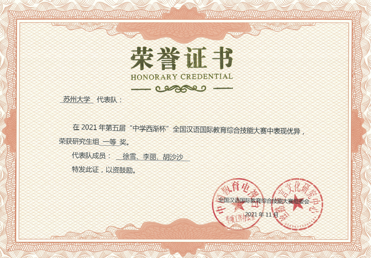 2021年11月27日,由中国教育电视台、丝路语言文化研究中心、教育部国家语言文字推广基地、河南中医药大学和厦门中学西渐信息科技有限公司共同举办的第五届“中学西渐杯”全国汉语国际教育综合技能大赛隆重举行。本届大赛首次开放汉语国际教育专业研究生报名,来自全国111所高校的130支队伍在初赛选拔和总决赛阶段充分展示了汉语国际教育专业的教学成果、名师风采与学子素养。在总决赛当天的激烈角逐中,由文学院2019级汉语国际教育本科专业三位同学(韩怡琳、朱子馨、侯言娜)以及由2020级汉语国际教育硕士专业的三位同学(李丽、徐雪、胡沙沙)组成的苏州大学代表队团结协作,奋力拼搏,表现优异,荣获本科生一等奖和研究生组一等奖,此外,韩怡琳、朱子馨两位同学分别荣获本科组教学技能、主题演讲单项第一名,我院六位指导教师获“优秀指导教师”称号。