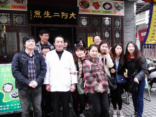 一队则到达了山塘街,开始了他们的美食之旅。山塘街历史悠久,它始建于唐代宝历年间,至今已有一千一百余年,相传乃是唐代大诗人白居易所建,一直被誉为“姑苏第一名街”。古色古香的建筑瞬间吸引了同学们的眼球,路两旁鳞次栉比的店铺�人潮涌动。而走在青石板路上,不时可以闻到一阵阵食物的香气。大家在队长的带领下,寻找到一家老字号店铺,品尝了美味的生煎包。大部分韩国留学生都是第一次尝试这些食物,不过他们纷纷表示中国小吃很是美味。可能很多中国人都通过韩剧《大长今》了解到了韩食的魅力,而此次姑苏美食之旅无疑给了韩国留学生一个亲自了解中国美食及深厚文化底蕴的机会。