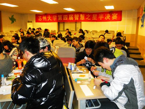 比赛的内容同样逸趣横生:剪小人游戏要求选手在五分钟内按照参照物剪出相类似的小人。男生笨拙地拿着剪刀,不灵活地转动着,力求剪出原版模样。在“纸质小车”这个环节中,大家的团队合作能力得到了切实的考验。限时十五分钟,各队绞尽脑汁,想方设法,尽显神通,选手们展示了他们的动手能力、思维能力以及团队合作能力。
