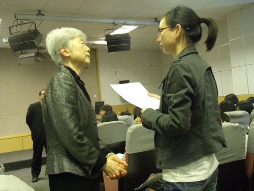 马真教授的演讲结束后,曹炜老师戏称要与国际接轨,鼓励同学们大胆地向教授提出问题。出乎意料,同学们的提问异常踊跃。面对每一个问题,马真教授都不疾不徐娓娓道来,有时同学问题的思路有些混乱,她也十分耐心地帮其梳理清楚再解答。她注重培养同学们勤于思考的能力,形成了良好的互动。