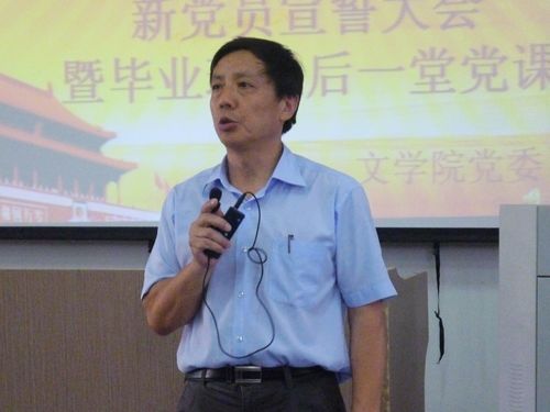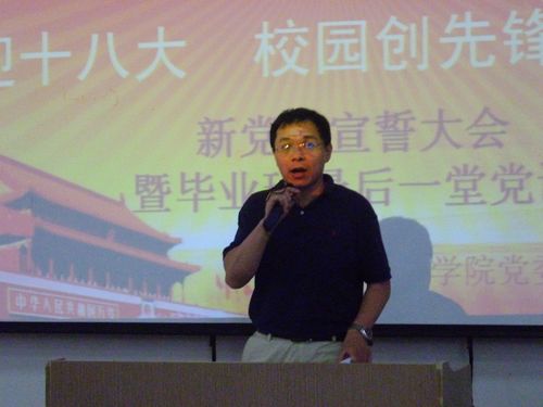 接下来是王六一书记的讲话,他重点向大家阐述了新时期对学生党员的要求:1.牢固树立党员标准意识,增强全心全意为人民服务的自觉性。2.刻苦学习科学文化知识,不断丰富和提高建设有中国特色社会主义事业所必须的知识与本领。3.积极参加革命实践,自觉接受党组织的考验。