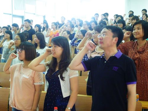 然后就是最重要的宣誓环节,大家全体起立,持立正姿势,面向党旗,举右手握拳宣誓。由领誓人王六一书记逐句领读誓词后,按领誓人�宣誓人顺序依次报出姓名。由于人数众多,并没有依次报出名字,而是大家同时说出各自的名字,一时间,教室里的声音震耳欲聋。