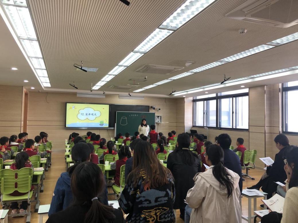 实习生周雨欣同学在录播教室执教了本次公开课,授课内容是部编版二年级上册的《坐井观天》。上课伊始,周雨欣带着学生读写了课题“坐井观天”,并且带学生认识了课文的主人公:青蛙和小鸟,并以“这两只小动物吵吵闹闹,它们之间发生了什么故事呢?”巧妙提出疑问,导入教学。接着,是整堂课的重点内容,周雨欣围绕着青蛙和小鸟争论“天有多大”的三次对话展开教学,引导学生在分角色朗读中理解青蛙和小鸟对于“天”的不同看法,通过启发诱导的方式引导学生思考青蛙和小鸟产生不同看法的原因。最后,周雨欣给同学们总结了坐井观天的寓意:懂得认识事物、看待问题,站得高才能看得全面。