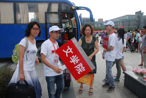 上午10点,随着几辆接送新生专车的抵达,大批的的新生进入校园,志愿者们更是忙碌了起来。从大门口到停车点,到处可见高举着院系名牌的志愿者。尽管疲劳,志愿者们仍然坚持工作,以饱满的热情迎接新生。