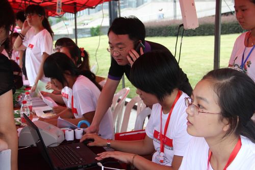 28号清晨,志愿者们冒着初秋微凉的细雨,早早地在炳麟图书馆等候前来报到的新生。近七点,便有新生陆陆续续地前来报到注册。刷卡登记、确认缴费、领取相关材料及注册条到志愿导向,迎新工作被安排的细致详密,工作井然有序,志愿者们认真负责,不厌其烦地为新生及其家长讲解问题,学生和家长的各种疑问等能够得到满意的答复。