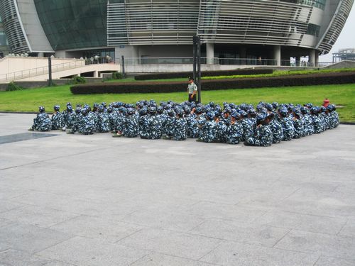 今天的训练内容是上午各自带队练习,下午则是在炳麟图书馆前的广场上全体模拟训练,因为明天是所有新生的“大日子”――阅兵仪式。文学院的队伍在所有队伍中很是显眼,不仅因为是120名清一色女生组成的,更是因为所有女生穿着军装散发出的英姿飒爽让人瞩目,就如她们的教官所说的:“穿上迷彩,你就是半个军人!”正步走时她们挺直腰板,摆臂有力,目光如炬,可当教官说全体休息的时候,她们的疲惫也让人心疼了,看的出来,十几天的军训强度还是很大的,据采访还了解到,有一个同学的脚昨天崴了,但她依旧奋斗在战场上,她们这种艰苦奋斗的精神不禁让人为之钦佩不已。