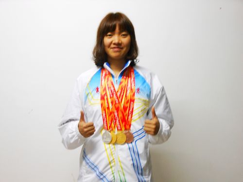 她是孟祥�,苏州大学文学院11级汉语言文学的学生。正是这个来自河北唐山的爽朗女孩,在刚刚落下帷幕的中国第九届大学生,取得了女子游泳项目的两块金牌、一块银牌和一块铜牌的骄人成绩。