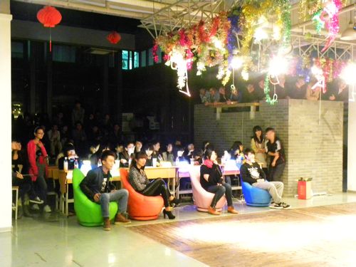 比赛还没开始,现场就充满了欢声笑语,观众席上早已经坐满了观战的学生,个个都议论着选手们;主办方那边也忙的不可开交,以保证一切设备运行正常;而选手们更是紧张地准备着自己将要演唱的歌曲,低着头背着歌词。一进去,你就会被这紧张而热闹的气氛所感染。
