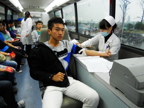 而在采血车里,负责采血的医护人员一刻都没有停下,他们面前输血的位置刚刚空下,立刻就有人补上。无论男生女生,都沉默不语,只是默默地将自己的手臂露出来,不一会儿,鲜红的血液源源不断地从血管中流入血袋,看着那些带着温度的红色液体不断流动,就像看到它们流向无数身处病痛魔爪的人的身体里,为他们带来新鲜的活力和生的希望。