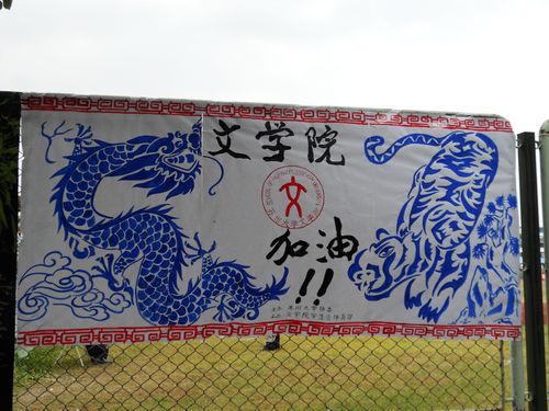 虽然离开幕式还有几个小时,但东区的校园里就已经紧锣密鼓地开始了运动会的准备工作。红色、绿色……穿着者各式各样院服的同学们穿梭在体育场周围,而文学院的白色和唐文治书院的红色在这些色彩中尤为醒目。随着各个校区的同学们的到来,各种富有创意和才情的宣传画也贴满了校园的街道两旁。文学院的海报只有一张,但质量远胜过数量,干净的画面,极具中国风采的蓝色龙虎,表现出“龙虎相斗,风生水起”的强大气场。
