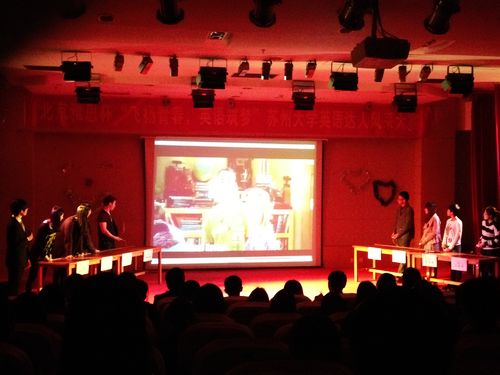此次大赛共分为五个环节,分别为:年少时光的青春影像、永不忘记的青春动作、滴水穿石的单词记忆、激情四射的歌舞青春和观众抽奖。在主持人简短和流畅地介绍后,八位选手上台开始了第一环节。主持人通过播放四段视频再提出问题,由选手们进行抢答。其中四号选手吉飞的精彩抢答赢得了场下观众的热烈掌声。第二环节永不忘记的青春动作由每一位参赛选手及其搭档进行你演我猜的表演。大屏幕上提示关键词后由搭档进行表演,选手猜出正确的英文单词。提示词涉及各方各面,搭档们的表演也让现场的气氛变得热烈起来。其中二号选手高璐璐及其搭档的默契配合让场下的观众一致叫好。