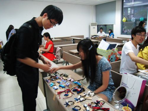 在众多摊位中,一个专卖自制手工蝴蝶结发卡的摊位吸引了众多顾客的眼球,她们纷纷在小摊位前驻足。出售的蝴蝶结发卡颜色、形状各异,做工精美。许多顾客心动不已,便与商店的推销员还起价来。此处还价声响了起来,停留在其他摊位的顾客们也开始和推销员们砍价。顿时,买的买,卖的卖,讨价声,还价声,混成一片,真是热闹非凡。在跳蚤市场中,还设有义捐点,许多同学纷纷捐献出自己不需要的书籍,而这些书籍将会以同学们的名义捐献给希望工程。