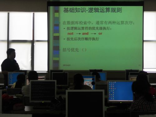 如何高效地在浩渺的书海里觅到你要的一套作品、一本书抑或一篇文章,如何充分利用好电子阅览室以及信息检索?2013年6月5号下午两点,炳麟图书馆四楼电子阅览室中,由文学院团委主办,文院科协承办的主题为“计算机文献检索”的讲座准时开始,当天活动有幸邀请到来自信息咨询部的徐旭光老师主讲,旨在辅导同学们进行有效的图书馆信息检索。