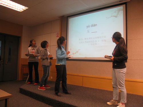 第四轮的比赛与第二、三轮的都不同,第四轮比赛是以小组赛的方式进行比赛。场上的6为选手被随机分成两组,每组三人,根据屏幕上的成语拼音写出该成语中空缺的字。最终冯心瑶、陈婷芳和周霞以微弱优势进入总决赛。在这三人之间,又进行了激烈的比拼。总决赛的比赛规则是三名选手各有三次答题机会,题目分10分题,5分题和3分题,选手选题回答,答对加分,答错不扣分,得分较多的选手获胜。最终,冯心瑶以绝对优势获得了比赛的一等奖,成为了当之无愧的汉字英雄!陈婷芳和周霞获得了比赛的二等奖。刘炜,张娅和李映晓获得了比赛的三等奖。各位选手的精彩表现赢得了现场热烈的掌声。