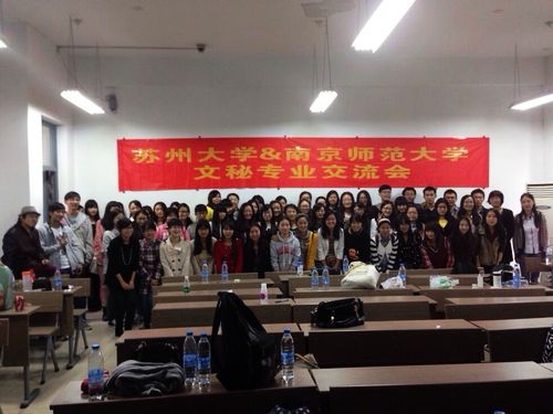 交流会进行到第三个环节。南师大的一位学生代表上台发言,依次从课程安排、师资力量、班级建设、就业发展等四个方面介绍了本校的专业特色。首先,在课程安排方面,南师大开办了一类“博雅课”,此项课程形式新颖,内容富有活力,旨在提高学生的综合素质。其次,在师资力量方面,南师大拥有郦波、冒志祥、胡元德、胡明波、端传妹等五位教学能力一流的老师。另外,班级活动多样,分为学术活动(如“文秘达人”)和娱乐活动(如春秋游、聚餐、棋牌赛等)两大类,这些活动多为学生自主策划举办,对提高班级凝聚力很有帮助。最后介绍的是就业发展情况,在南师大文秘专业学生中,考研、保研者各占8%―14%,公务员占12%―24%,从事其他工作者占69%。此番介绍的内容详实清晰,发言的同学也十分落落大方。紧随其后的是我校同学介绍专业情况。由于我校文秘班成立仅一个月,各类活动开办较少,在剩下的两年学习时间里,我校的文秘专业会加强与南师大的交流学习,以求尽快发展完善。