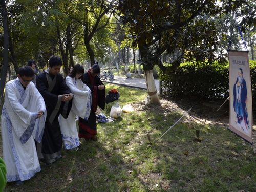 首先,主持人李沁怡向活动参与者介绍了将学术由贵族下移至平民的古圣孔子的主要思想及沿袭至今的祭孔大典的主要步骤。随后,在主持人的组织下,由四位身着汉服的同学带领,参加同学一起进行了祭孔仪式。祭孔的最重要议程是三献礼,主祭人要先整衣冠、洗手后才能到孔子香案前上香鞠躬,鞠躬作揖时男的要左手在前右手在后,女的要右手在前左手在后。所谓三献,分初献、亚献和终献。这一项活动,表达了现今人们对于传统文化的敬仰与传承。