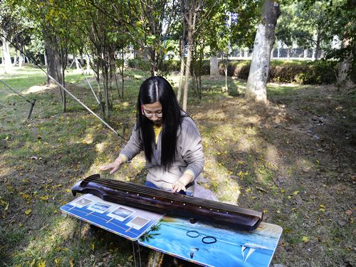 紧接着,大家一起齐声诵读了古圣先贤的优秀著作,感受了传统文化的源远流长与博大精深。之后,弄潮文学社社长冯心瑶现场弹奏了一曲古琴曲《长门怨》。此曲取材司马相如《长门赋》凄婉哀怨,曲调悲郁缠绵,如泣如诉,冯心瑶同学的精妙的演绎,与秋风萧瑟中飘飞的片片枯黄凋萎的梧桐营造的凄清静谧的氛围相得益彰,使人很好地感受到当年陈皇后的孤寂幽怨与一往情深。在这时而凄婉绵长如杜宇泣血,时而深沉厚重如磐石沉水的古琴声中,参与的同学们铺开宣纸,研出墨汁,用毛笔在纸上写下了自己此时的所思所感。