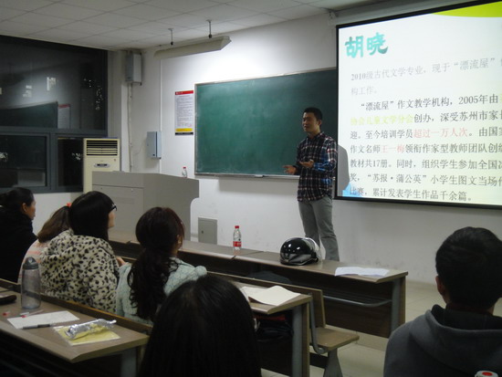 压轴登场的胡晓,来自文学院2010级古代文学专业,现在任职于“漂流屋”作文教学机构。他向大家强调,在就业与毕业论文写作二者冲突的时候,一定要选择后者,不能舍本逐末,让三年的辛苦付之东流。胡晓结合自身经历,讲述了他的求职过程,虽然曲折,但最终都能有满意的结果。在这其间,保持平和就业的心态非常重要。选择什么样的职业,要根据自己的兴趣和机遇来,不能盲目攀比,任何职业都有它的意义和前景。最后胡晓不忘嘱咐在场的学弟学妹们,专业知识真的很重要,常常会在不经意间发挥作用,所以大家要珍惜校园时光,每一份努力都是在为今后做准备。