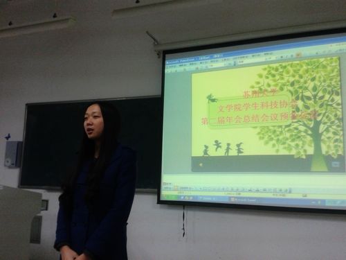 接着14位部长依次对各自工作进行了总结展示。首先进行总结的是论坛部部长尚卉,论坛部本学期共举办3场吴门雅韵系列讲座以及多场学术讲坛,为文学院同学带来了文化的饕餮盛宴,在她看来,每一次学术活动的成功都是论坛部人共同努力的结果。然后是办公室部长陈阳进行总结,她没有具体展示自己所做的各项工作,而是用一首细腻温婉诗的写出自己这个学期里的成长,从招新到写通讯,科协给她留下来许多难以磨灭的美丽记忆。紧接着,企划部部长张云云也进行了个人总结,她用一张张PPT将企划部这半年来走过的路完整地展现给大家,既有策划活动时的苦恼,也要活动举办后的喜悦,给所有人留下了深刻印象。联部部长徐会娟则用舒缓稳重的语调讲述了她这半个学期为科协活动拉赞助的经历,让大家了解到拉赞助的艰辛,但徐会娟却十分感谢科协给了她这样一个宝贵的锻炼机会。项目部部长黄奕丹没有过多强调自己所做的工作,而是和大家分享了她对自己、对项目部、对科协的疑惑与想法,真实中肯的表述令人印象深刻。活动部部长张怡首先感谢了理事长和各位部长一学期来对活动部工作的大力支持,然后客观地总结了活动部工作的中得与失,并表示下学期活动部会做的更好。洪敏、孙健风、王璇、王柳菁、黄欣、甄真珍、任媛媛等其他部长也分别对自己的工作进行了总结汇报。