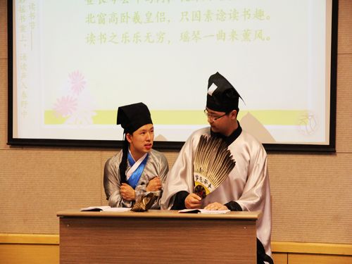 听惯了侃侃而谈的礼仪之课,轻松幽默的小话剧更能体现孔子所提倡的“寓教于乐”。接下来的阿毛和师傅所表演的节目“古今读书之礼――节气茶事”截取春夏秋冬典型之节日节气,通过贪吃爱玩的阿毛和知识渊博的师傅的一问一答,细细讲述这些节日节气的历史与吴地的一些习俗。演员们的表演落落大方,毫无拘泥之感。老师和同学们在下面乐开了怀,读书之乐,得见此时;读书之乐,又岂乐独乎在此时?