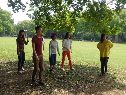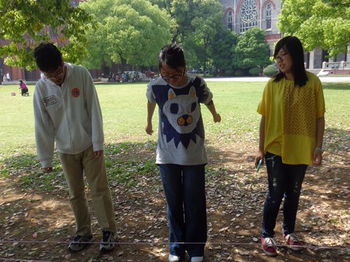 人来齐后,活动正式开始。首先是跳皮筋,在工作人员的带领下,中外友人分成两组,亦步亦趋地跟在领头人的后面,慢慢在实践中学习跳皮筋的规则和程序。可能是因为初学的缘故,大家还不是很熟练,时常闹出一些笑话,也时常会重心不稳,摇摇晃晃,惹得大家哈哈大笑。有些友人还是比较腼腆的,在旁边笑嘻嘻地看着,不怎么好意思加入进来。一位来自法国的朋友玩得很开心,在自己快乐之余还时常拉旁边的有人一起加入,“来嘛来嘛,大家一起玩,这个很好玩的。”也许是在他的影响下,草坪上的氛围渐渐地更加活跃了,大家积极加入游戏之中。玩了一会儿之后,一位韩国友人又出了一个新点子,将皮筋当作绳儿来跳,获得了大家的一致地赞许,就这样,一样工具大伙儿玩出了两种花样,大家在绳摆间穿梭,偶尔会有人在途中受阻,引得笑声阵阵。