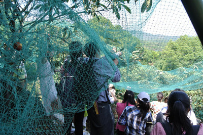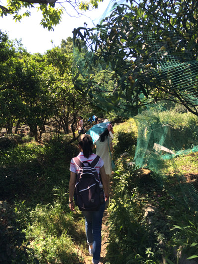 驱车近一个半小时,大家终于来到了目的地――西山缥缈村。在用过午餐稍作休息后,大家便跟着当地村民从一条山间小径向缥缈峰迈进。很多同学一直生活在城市中,这么近距离地接触山野田园的机会屈指可数,他们对两边的植物充满了兴趣。大家争先恐后向村民询问,村民则一一讲解。遇到同学们常吃的杨梅、板栗等,村民还特别给大家指认,并介绍它们的生长周期、采摘后的加工方法等。由于山路为村民自开,又有青苔覆盖,有些地方湿滑而陡,同学们一个个手拉手,互帮互助,向上攀行。走在队伍前面的同学不时回过头来向后面同学报告路况,后面的同学也高声喊话鼓励前面同学。