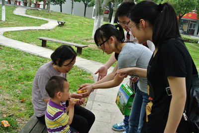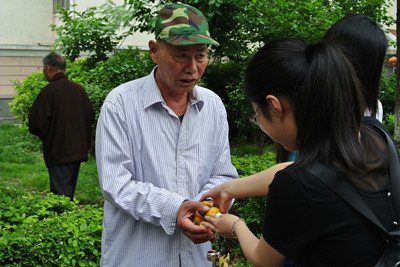 转过一些拐角,走过几个陡坡,大家终于来到了接近山峰顶端的枇杷园,采枇杷的活动正式开始。大家三五成群,自行组队,围绕着不同的枇杷树精挑细选,一边根据生活经验评点眼前枇杷的优劣,一边将中意的枇杷采摘下来。因为大家都清楚本次活动还有一层更重要的意义。本次活动既是素质拓展,让大家走进山林,体验农家生活;又是一次献爱心活动,采摘下的枇杷将作为礼物孝敬给社区的老人,因此大家都格外用心。大家也品尝或分享自己亲手摘下的果实,遇到一棵树上果实都特别甜的,则邀请其他同学一起来摘。 同学们沉浸于亲自劳动和奉献爱心的双重喜悦中,不觉时光飞逝。农家定下的半小时的采摘时间很快过去了,大家都带着丰盛的果实下山。虽然有些劳累,但想到无论是体质还是意志,都得到一次锻炼,同学们脸上都洋溢着微笑。 5月25日下午,在提前与莲花新�三社区联系好后,支部党员学生赴社区将从西山采摘带回的青种枇杷分发给社区老人,让老人们不出家门、不用花钱便能品尝时鲜。社区老人们不住向同学们表示感谢和赞许,而同学们一方面因能把自己劳动所获孝敬老人而欣喜,一方面也觉得做的还很不足以后需要更加努力。