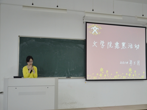 今天是2014年5月22日,星期四。由文学院团委组织发起的惠寒宣讲活动在文综楼1003-3303温暖进行。此次到场的嘉宾有文学院团委书记胡萱老师和文学院团委副书记赵曜老师。