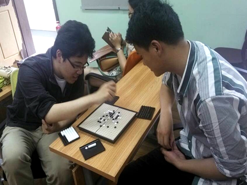 在搜索了教室里面的物品之后,来自日本的滨北诚司找到了一副围棋,但是大家都不会围棋,于是就利用这副围棋下起了五子棋。滨北诚司同学一副久经沙场的样子,那思考的架势一摆出来就让人心生胆怯,有好几次他还说出了“噢,你放这里啊~”,让对手惶恐地觉得他的潜台词是“正中我下怀”。但是他也有失误的时候,在场观战的同学也常常听到“唉,我这什么眼神儿啊”之类的感叹。后来,我们又鼓励了几个不会下五子棋但是又很感兴趣的外国同学,他们都很乐意地尝试了一下,并且表示以后会自己买一副五子棋和同学切磋。