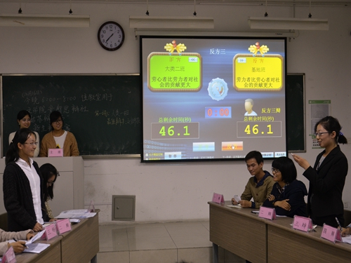 稍作休息,精彩不停。第二场辩论赛接踵而至。辩题为“劳心者与劳力者谁对社会的贡献大”。正方文院大类二班辩题为劳心者贡献更大,反方文院基地班辩题为劳力者贡献更大。在辩论中,实践与认识的关系,劳力者和劳心者的定义都被多次提及。双方各执一词,引经据典,多次碰撞使观众领略到了辩论的美。之后评委分别就两次辩论赛进行精彩点评。