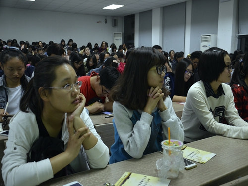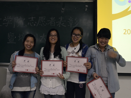 忙碌有序的签到之后,活动正式开始。在部长刘菲菲的主持下,首先进行的是2013-2014优秀志愿者表彰。朱联亚、刘星伽、倪琳、周凌云四位同学凭借自己在志愿活动中的出色表现,受到表彰,并被授予荣誉证书。而后,13级的王洁同学作为优秀志愿者代表和大家分享了她在聋儿语训的志愿经历。她的服务对象是一群天真烂漫的孩子,但与别的孩子不一样的是,世界释放给她们的声音是细微的。他们的听力比常人弱,有的孩子甚至只能依赖于人工耳蜗来聆听这个世界。在这些孩子面前,志愿者不仅仅是志愿者,更多的是亲人。而在与孩子的相处中,志愿者们便成了孩子成长道路上的见证者,从而让志愿活动充满了公益性。王洁同学总结道,作为志愿者,重要的是有一颗平常心,因为志愿所得不仅是帮助他人,也更是帮助自己。在在场的同学极大的认同下,王洁同学向全体同学发出号召,呼吁大家共同参与到志愿活动中来,得到了热情的响应。