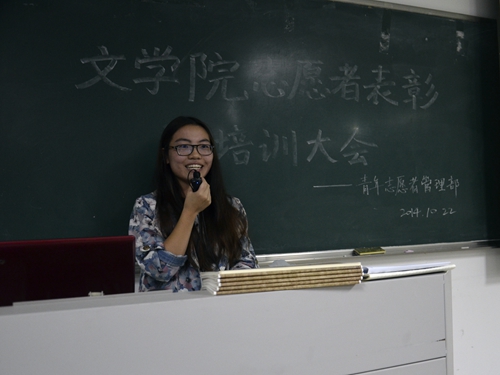 为鼓励优秀志愿者,并号召更多新生积极参与到志愿者活动中,由苏州大学文学院青年志愿者管理部主办的2013级优秀志愿者颁奖活动暨2014级文学院志愿者培训大会于10月22日晚8:00在1102教室如期举行。新老成员,新旧面孔,齐聚一室,共同展现了志愿团队壮大的希望和新的风采。